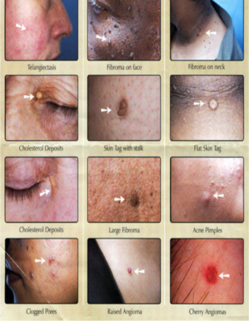 Lam Probe helps to remove those unsightly minor skin irregularities that bother us. These include milias (whiteheads), blackheads (comedones) fibromas (pigmented epidermal growths), broken capillaries, pimples or pustules, blood spots and skin tags that are prevalent on the neck and decollete area. The Lam Probe works on the principle of liquids being attracted to heat which is released by various probes. Treatments are very quick (some within a few seconds), and may not even touch the skin's surface. Small skin tags or blood spots disappear immediately and hyperpigmented areas such as liver or "age spots" take only a few seconds. There is minimal discomfort for the client patient and healing time is short, from a day or two for skin tags to a few weeks for larger skin abnormalities such as fibromas.